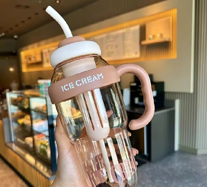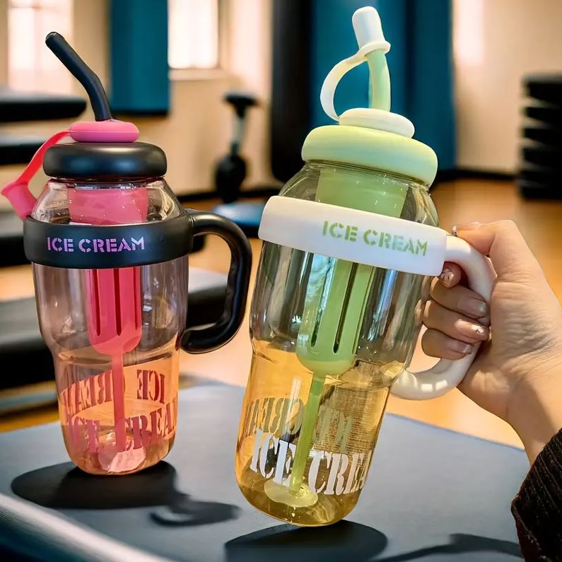 Add a scoop of fun to your hydration with these adorable ICE CREAM themed bottles. This set of 4 transparent bottles comes with pastel-colored caps and handles in brown, black, pink, and green. Each bottle features a straw and "ICE CREAM" text. Perfect for drinks on-the-go. Great for ice cream lovers, kids, or as a cute gift.